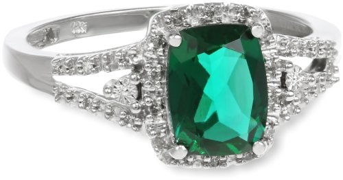 10k White Gold Cushion Created Emerald with Round Diamond Ring, Size 7 buy