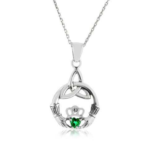 FEATURED 1/4 Carat Emerald & White Sapphire Claddagh Celtic Knot Pendant in Sterling Silver with 18" Chain